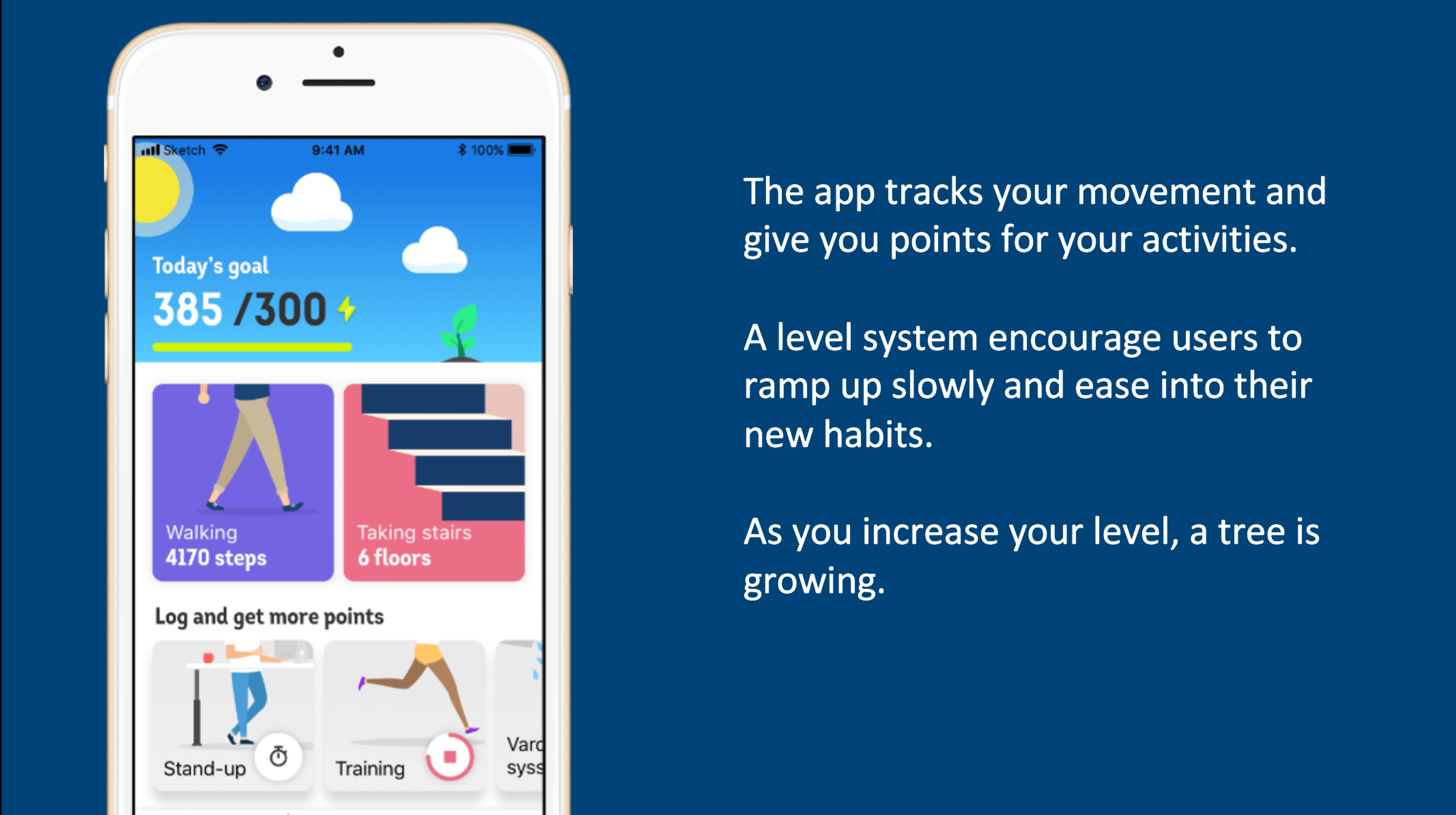 To get people enthused when they start using the app, the initial daily target is purposely set below the recommended daily activity level. After five consecutive days of accumulating the minimum number of points, the target increases. In total there are five different activity levels. Progressively increases targets in this way helps people stick to their new activity routines. This is particularly important since it generally takes at least two months for an activity to become a habit.